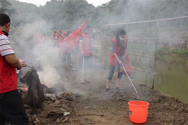 志愿者们满怀激情迎着烈日来到了沿河风光带,大家不怕脏、不怕累,手拿钳子、袋子共同协作,将河道旁散落的塑料袋、食品包装盒、饮料瓶、废纸等白色垃圾进行了清理和焚烧,经过近3个小时的清理,将沿路及河道旁的垃圾全部清理干净。