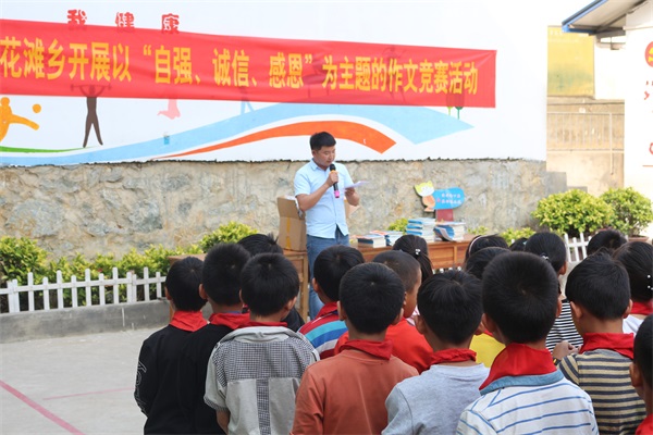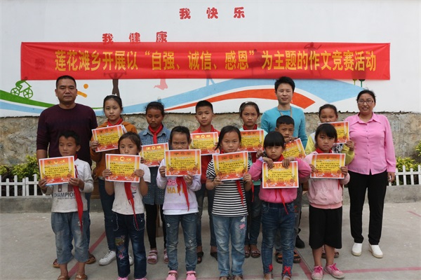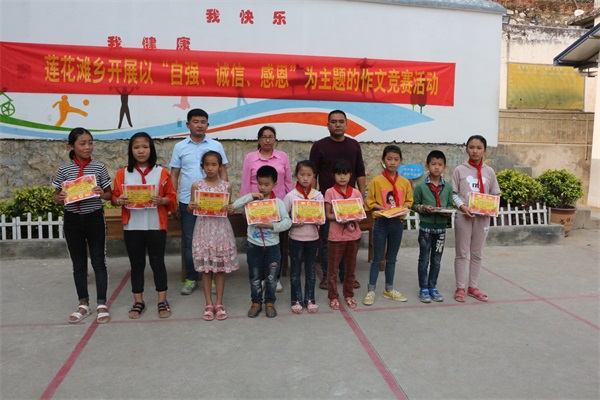 颁奖结束后,莲花滩乡宣传委员李涛对学生说到:“通过这次以“自强、诚信、感恩”为主题的作文竞赛活动,希望你们在学校好好读书,多学知识,做一个诚实守信知恩图报的人,长大了能回报社会的有用人才,通过学习具备勇敢拼搏的品质和创新精神,把学到的知识和才能赋予实践,创造价值,要学会感恩,抓住机会,回馈父母、学校与社会”。